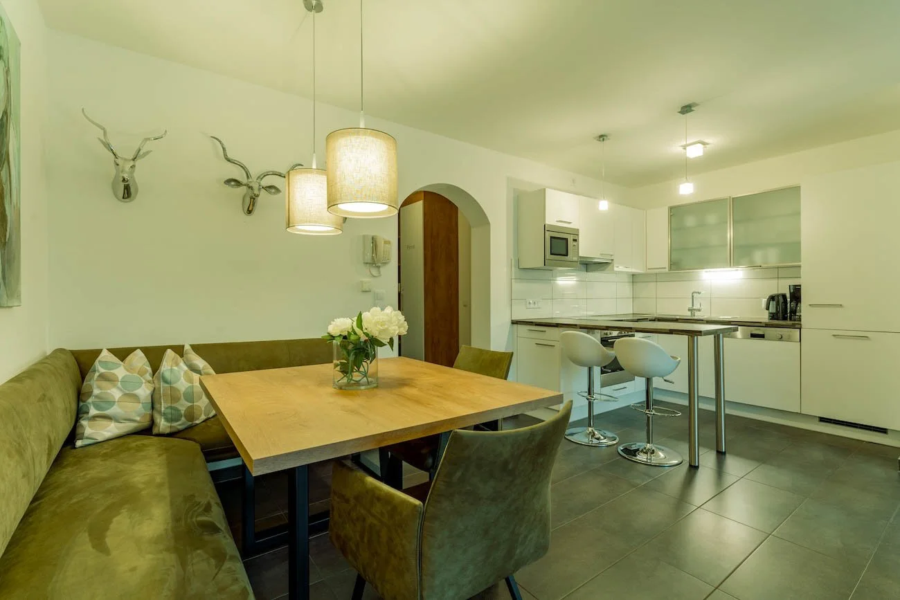 In Apartment 01 of the eder VIEW apartment building, you’ll enjoy 66 square meters of living space on the ground floor —relaxed, uncomplicated, and just right for families, groups of friends, or a vacation with your loved ones. Two bedrooms, an open-concept living and dining area, plus a kitchenette, sitting area, and terrace: here, vacation feels wonderfully carefree. Coffee in the morning with a view of the village. Cooking, laughing, and sitting together in the evening. And in between? Just living. Just letting go. Just being right in the middle of it all.